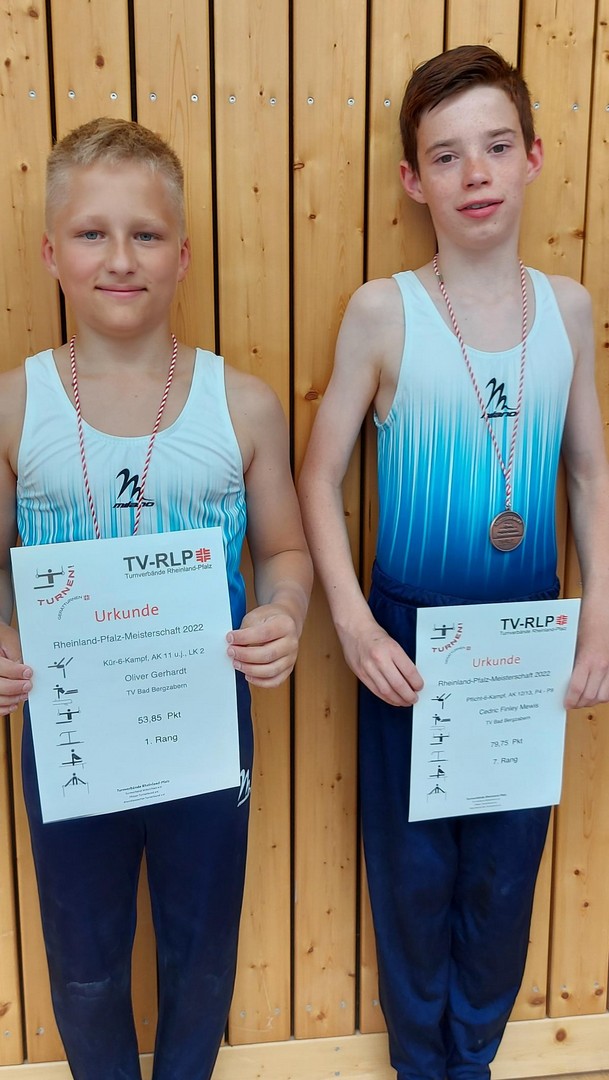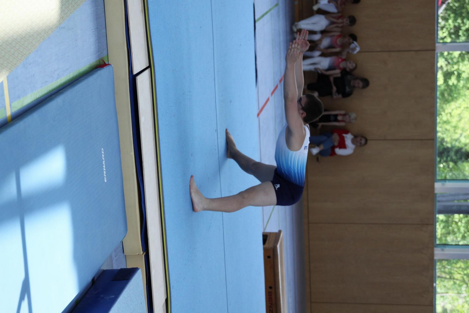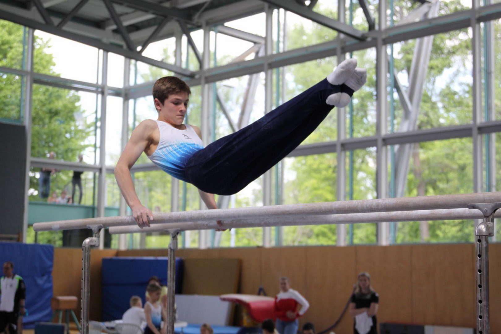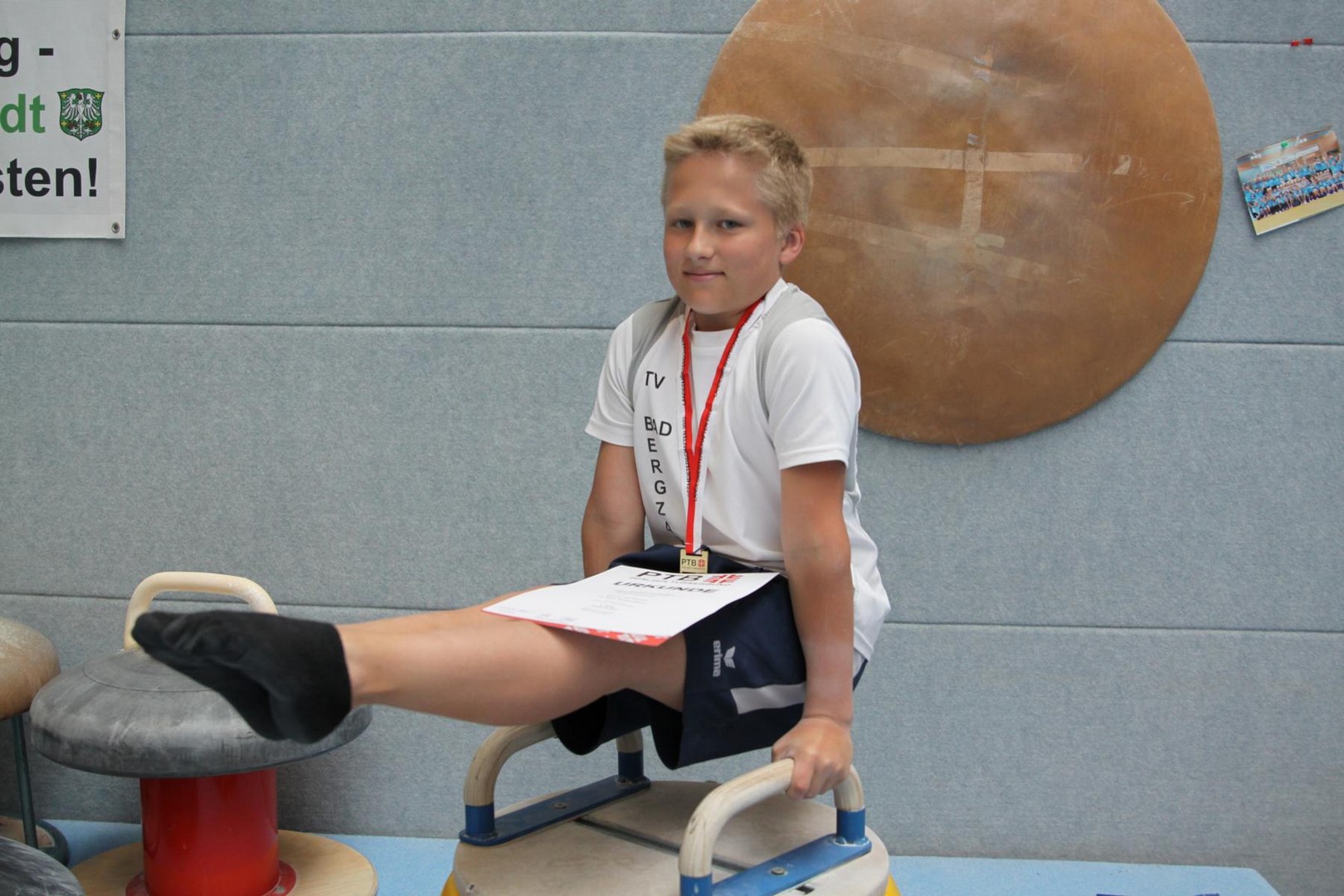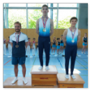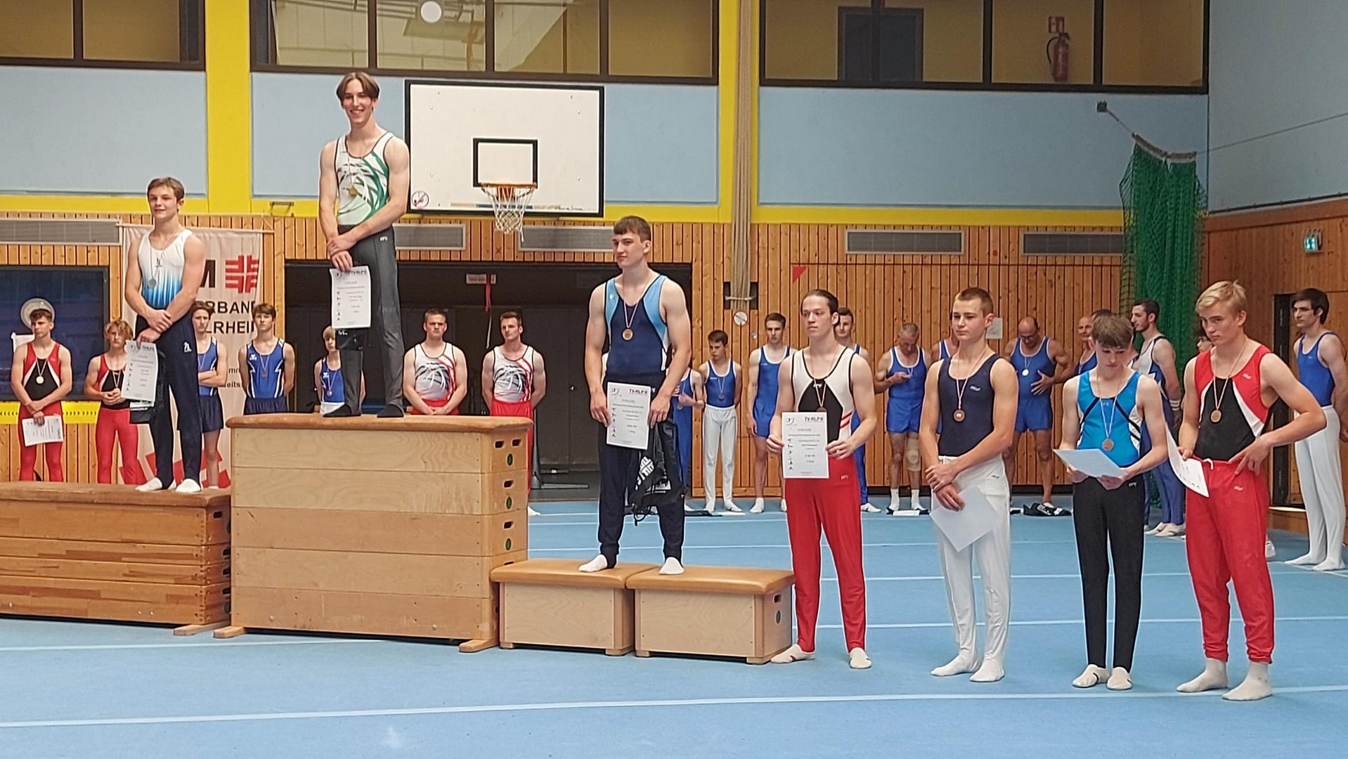 Mit vier Jungs hatte sich der TV Bad Bergzabern für diese Meisterschaften am 12.Juni in Koblenz qualifiziert: Cedric Mewis, Jahrg. 2010 im Pflichtwettkampf, Oliver Gerhardt,2011, Oskar Dietz, 2006, beide in der Leistungsklasse im Kürturnen, und Thomas Quint, 2004 im olympischen 6-Gerätewettkampf gemäß den internationalen Regeln. Schon recht früh mussten sie sich mit dem Trainer-Gespann David und Hermann Jäger auf den Weg machen, denn um 9:30 begann das Einturnen für die Ersten. Da jeder Verband auch Kampfrichter stellen muss, hatte David noch einen Platz am Barren bzw. Boden. Für Cedric waren es die ersten Rhld-Pfalz-Meisterschaften, da gilt zuerst, dabeisein ist alles, lernen, motivieren, verbessern… Seitpferd, super Übung, 13,4 Punkte, dritthöchste Wertung. An allen Geräten nur kleine Abstände nach vorne, einen halben Punkt, mal 0,8 Punkte, aber in der Summe sind es dann doch ca 4 Punkte, die zum begehrten dritten Platz noch fehlen. Der siebte Rang ist natürlich ein toller Einstieg bei den Besten in Rheinland-Pfalz.