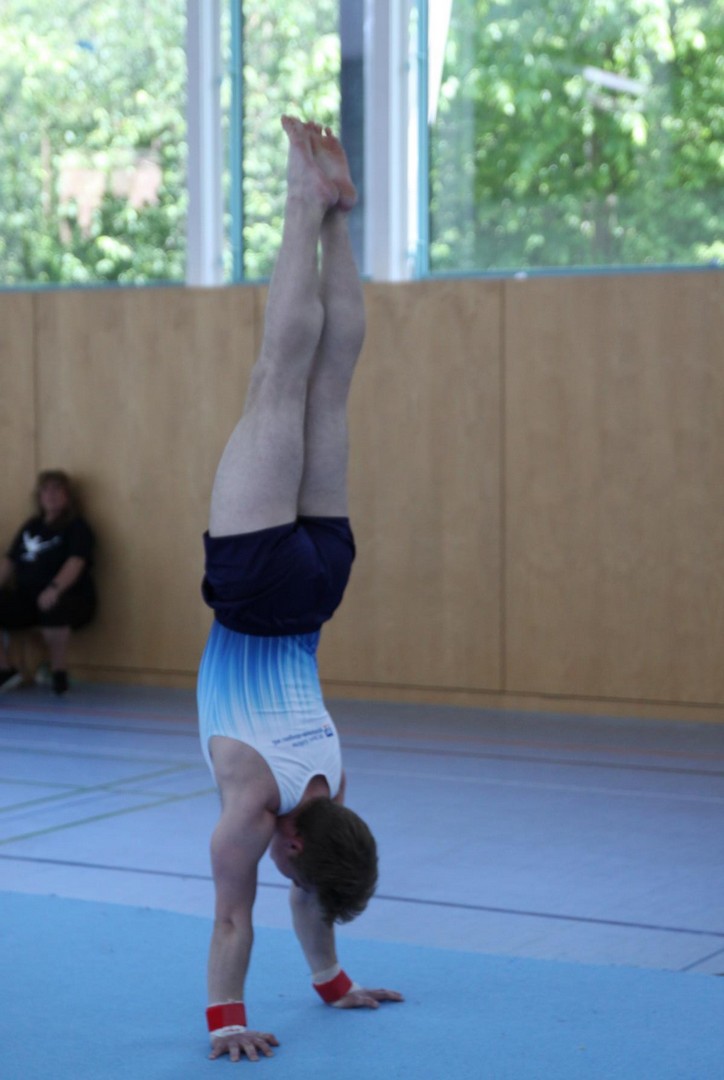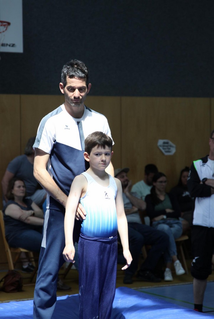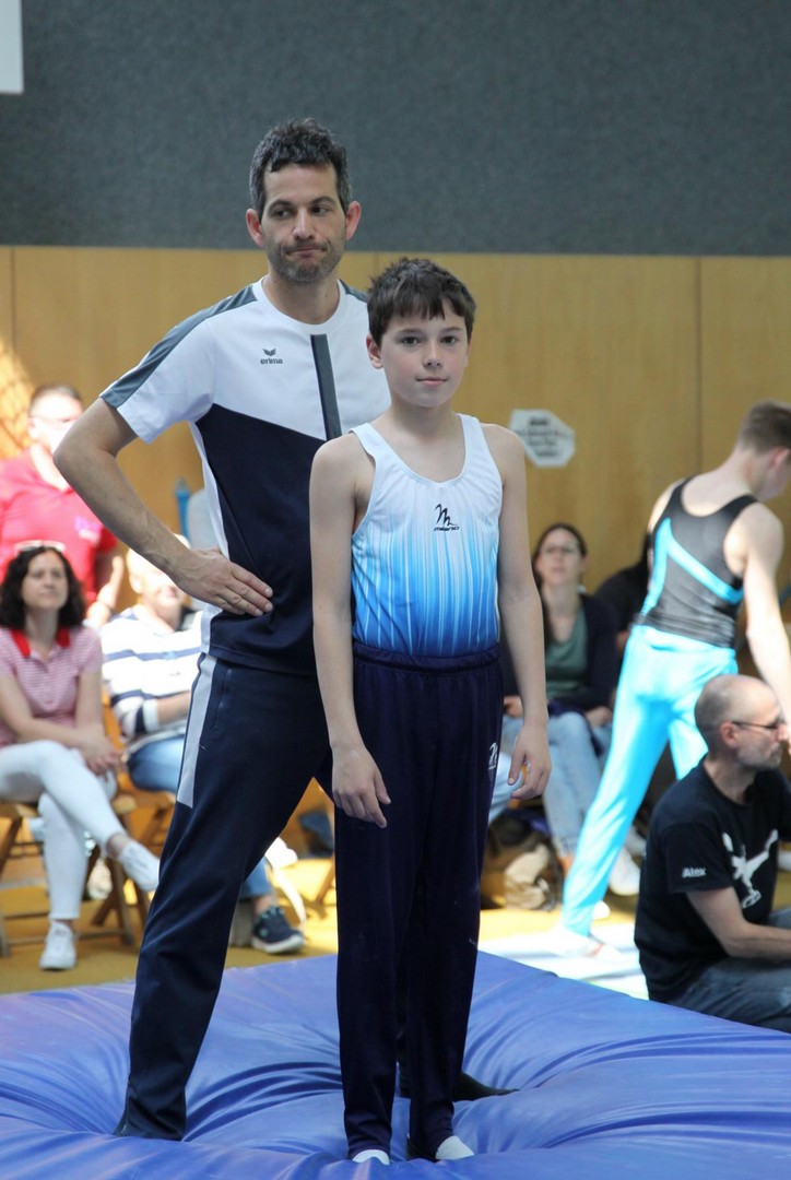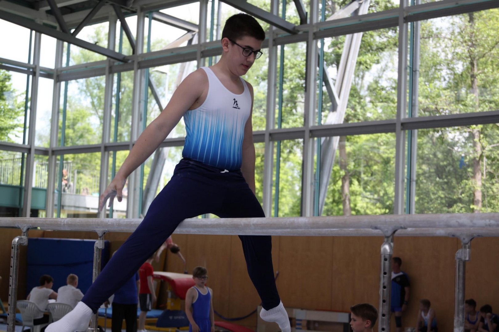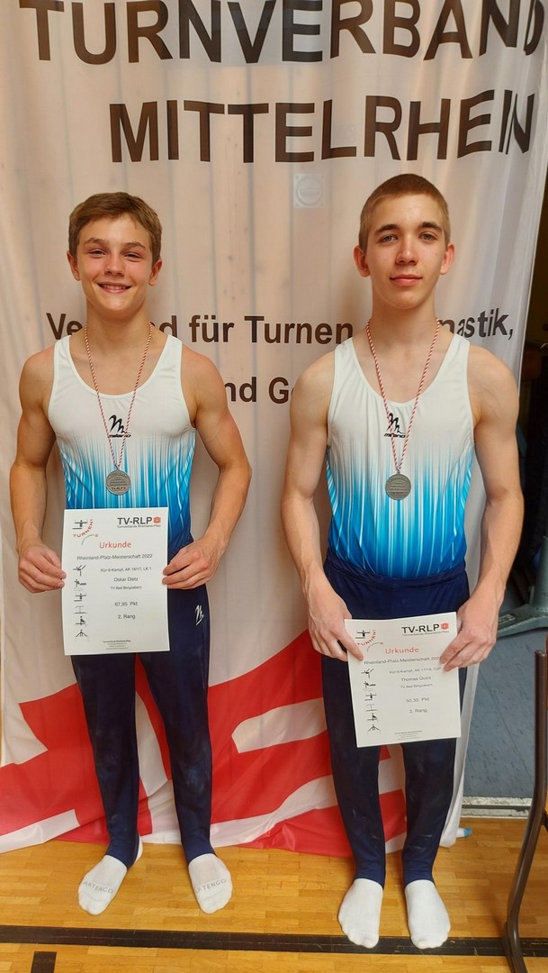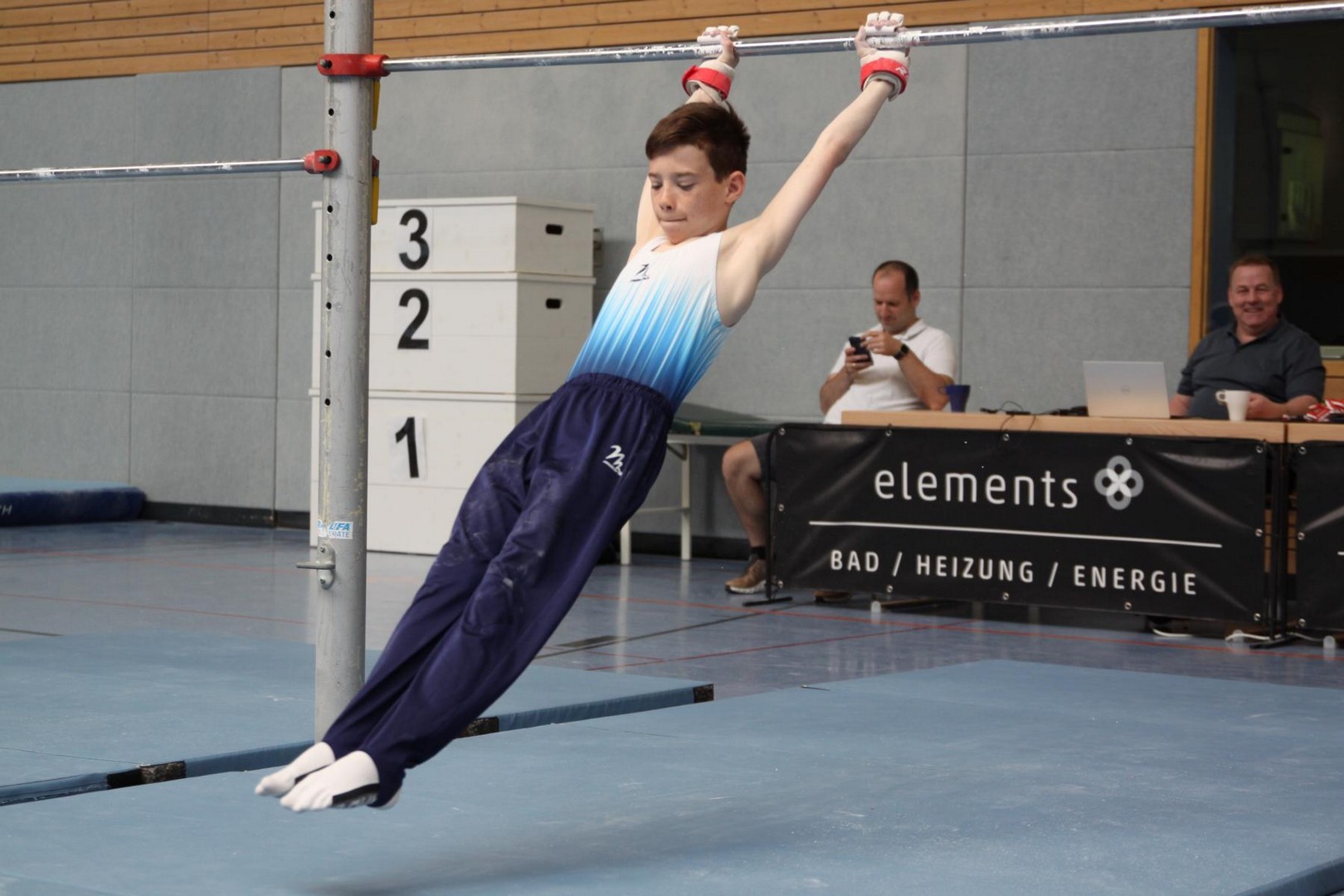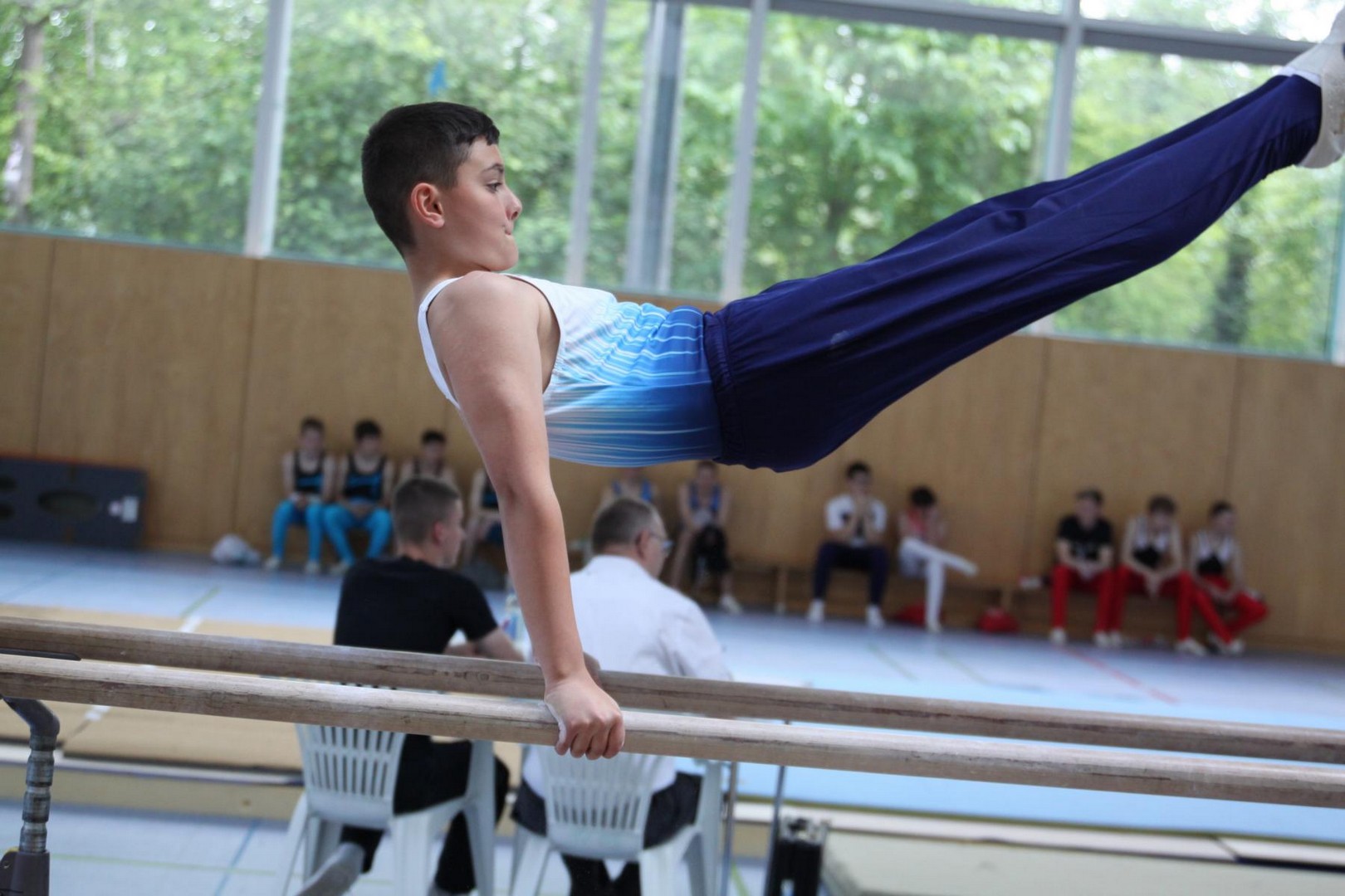 Mit vier Jungs hatte sich der TV Bad Bergzabern für diese Meisterschaften am 12.Juni in Koblenz qualifiziert: Cedric Mewis, Jahrg. 2010 im Pflichtwettkampf, Oliver Gerhardt,2011, Oskar Dietz, 2006, beide in der Leistungsklasse im Kürturnen, und Thomas Quint, 2004 im olympischen 6-Gerätewettkampf gemäß den internationalen Regeln. Schon recht früh mussten sie sich mit dem Trainer-Gespann David und Hermann Jäger auf den Weg machen, denn um 9:30 begann das Einturnen für die Ersten. Da jeder Verband auch Kampfrichter stellen muss, hatte David noch einen Platz am Barren bzw. Boden. Für Cedric waren es die ersten Rhld-Pfalz-Meisterschaften, da gilt zuerst, dabeisein ist alles, lernen, motivieren, verbessern… Seitpferd, super Übung, 13,4 Punkte, dritthöchste Wertung. An allen Geräten nur kleine Abstände nach vorne, einen halben Punkt, mal 0,8 Punkte, aber in der Summe sind es dann doch ca 4 Punkte, die zum begehrten dritten Platz noch fehlen. Der siebte Rang ist natürlich ein toller Einstieg bei den Besten in Rheinland-Pfalz.