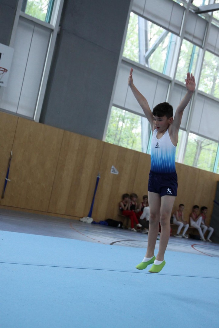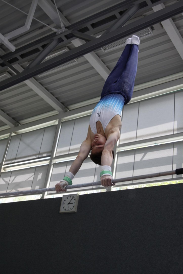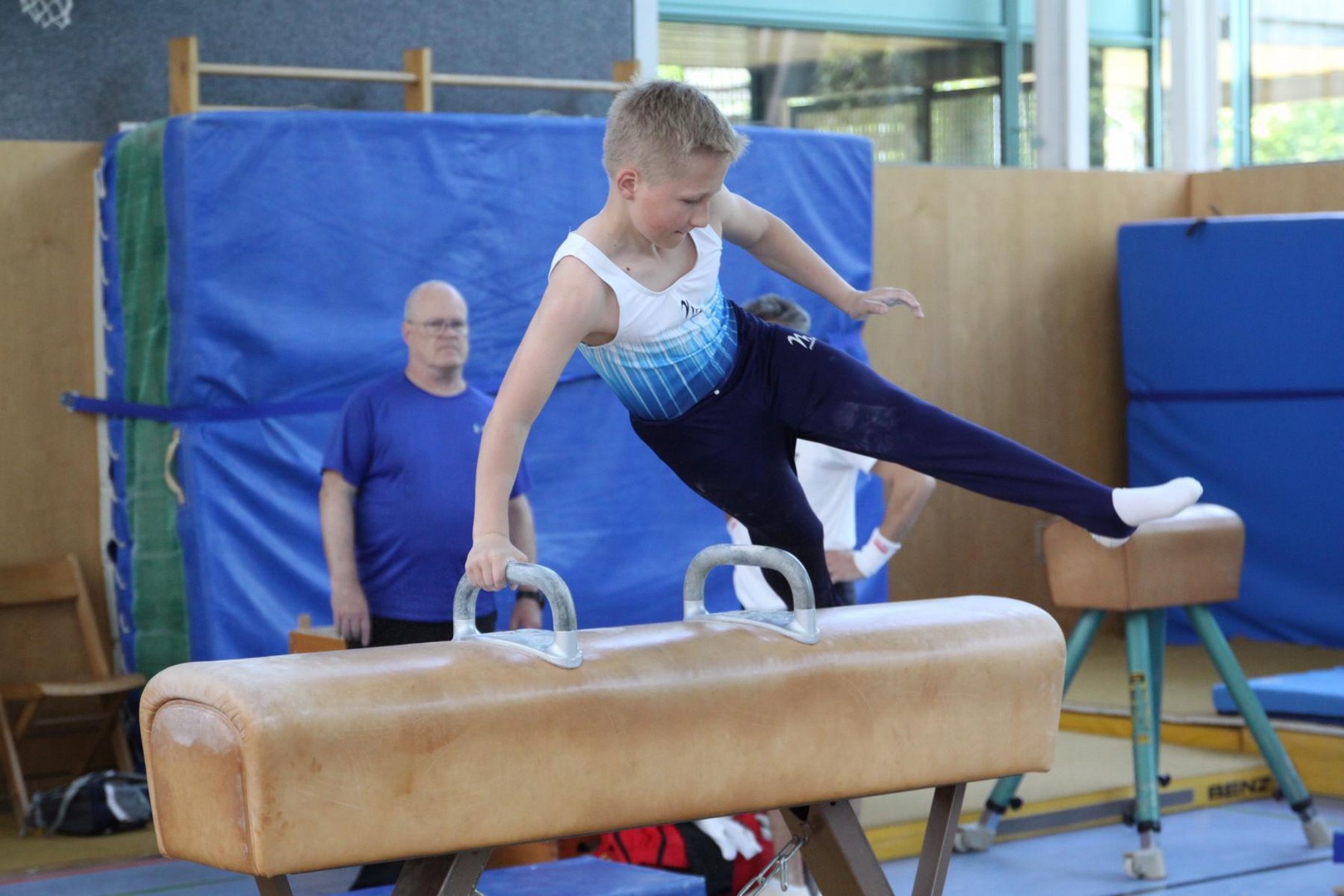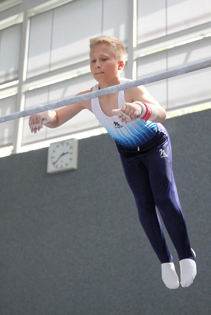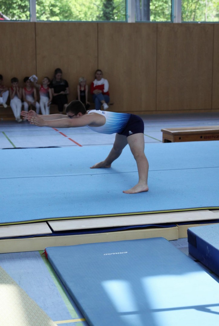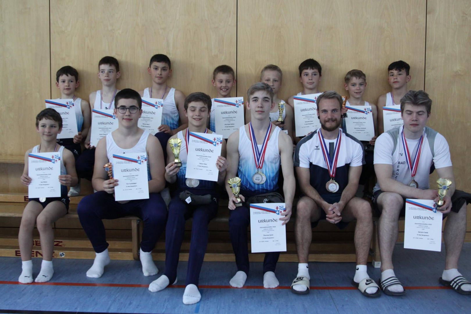 Mit vier Jungs hatte sich der TV Bad Bergzabern für diese Meisterschaften am 12.Juni in Koblenz qualifiziert: Cedric Mewis, Jahrg. 2010 im Pflichtwettkampf, Oliver Gerhardt,2011, Oskar Dietz, 2006, beide in der Leistungsklasse im Kürturnen, und Thomas Quint, 2004 im olympischen 6-Gerätewettkampf gemäß den internationalen Regeln. Schon recht früh mussten sie sich mit dem Trainer-Gespann David und Hermann Jäger auf den Weg machen, denn um 9:30 begann das Einturnen für die Ersten. Da jeder Verband auch Kampfrichter stellen muss, hatte David noch einen Platz am Barren bzw. Boden. Für Cedric waren es die ersten Rhld-Pfalz-Meisterschaften, da gilt zuerst, dabeisein ist alles, lernen, motivieren, verbessern… Seitpferd, super Übung, 13,4 Punkte, dritthöchste Wertung. An allen Geräten nur kleine Abstände nach vorne, einen halben Punkt, mal 0,8 Punkte, aber in der Summe sind es dann doch ca 4 Punkte, die zum begehrten dritten Platz noch fehlen. Der siebte Rang ist natürlich ein toller Einstieg bei den Besten in Rheinland-Pfalz.