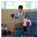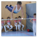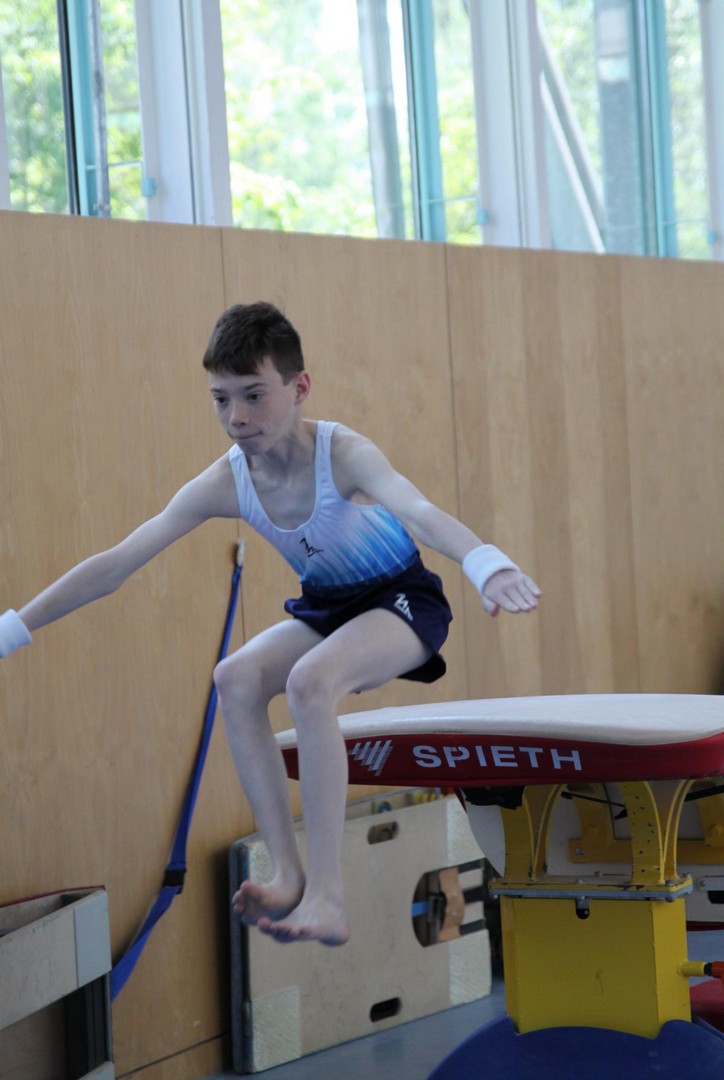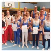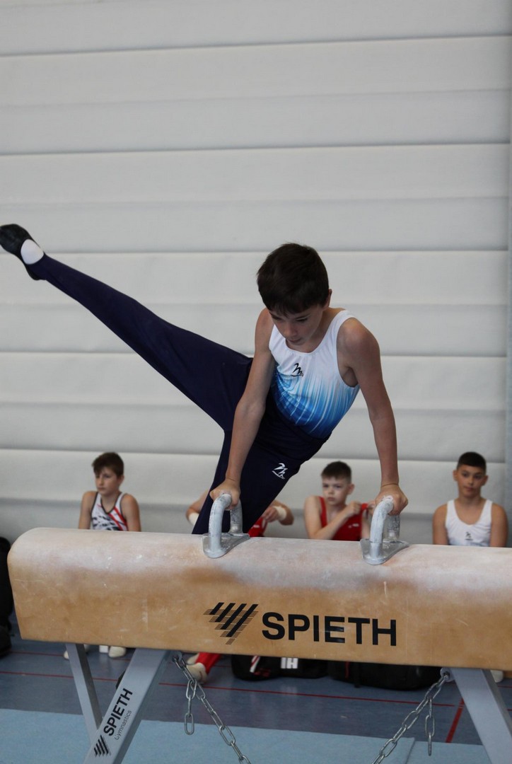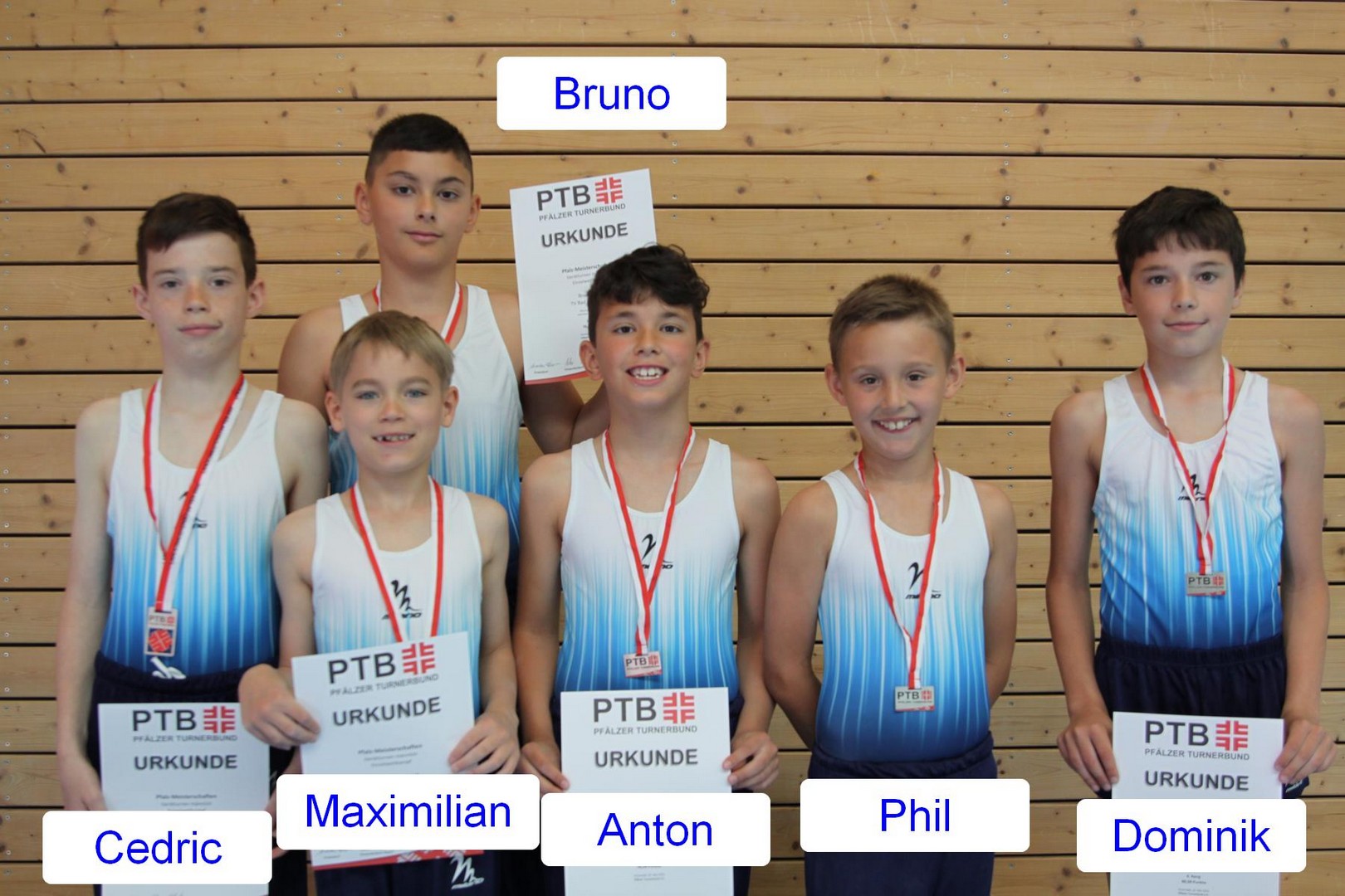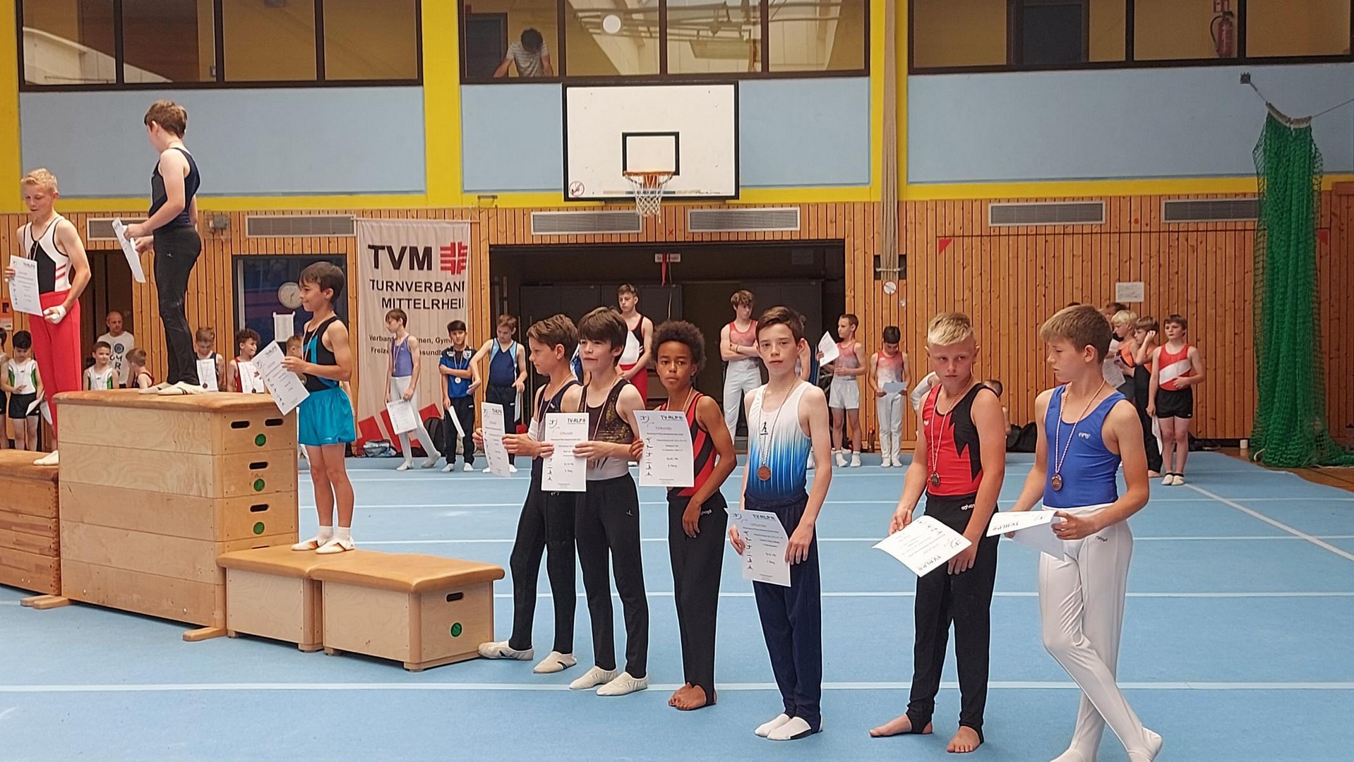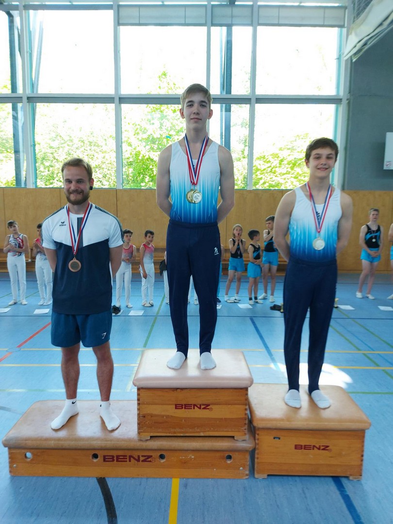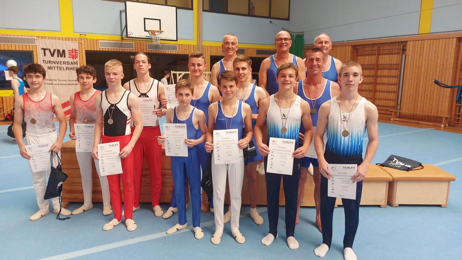 Mit vier Jungs hatte sich der TV Bad Bergzabern für diese Meisterschaften am 12.Juni in Koblenz qualifiziert: Cedric Mewis, Jahrg. 2010 im Pflichtwettkampf, Oliver Gerhardt,2011, Oskar Dietz, 2006, beide in der Leistungsklasse im Kürturnen, und Thomas Quint, 2004 im olympischen 6-Gerätewettkampf gemäß den internationalen Regeln. Schon recht früh mussten sie sich mit dem Trainer-Gespann David und Hermann Jäger auf den Weg machen, denn um 9:30 begann das Einturnen für die Ersten. Da jeder Verband auch Kampfrichter stellen muss, hatte David noch einen Platz am Barren bzw. Boden. Für Cedric waren es die ersten Rhld-Pfalz-Meisterschaften, da gilt zuerst, dabeisein ist alles, lernen, motivieren, verbessern… Seitpferd, super Übung, 13,4 Punkte, dritthöchste Wertung. An allen Geräten nur kleine Abstände nach vorne, einen halben Punkt, mal 0,8 Punkte, aber in der Summe sind es dann doch ca 4 Punkte, die zum begehrten dritten Platz noch fehlen. Der siebte Rang ist natürlich ein toller Einstieg bei den Besten in Rheinland-Pfalz.