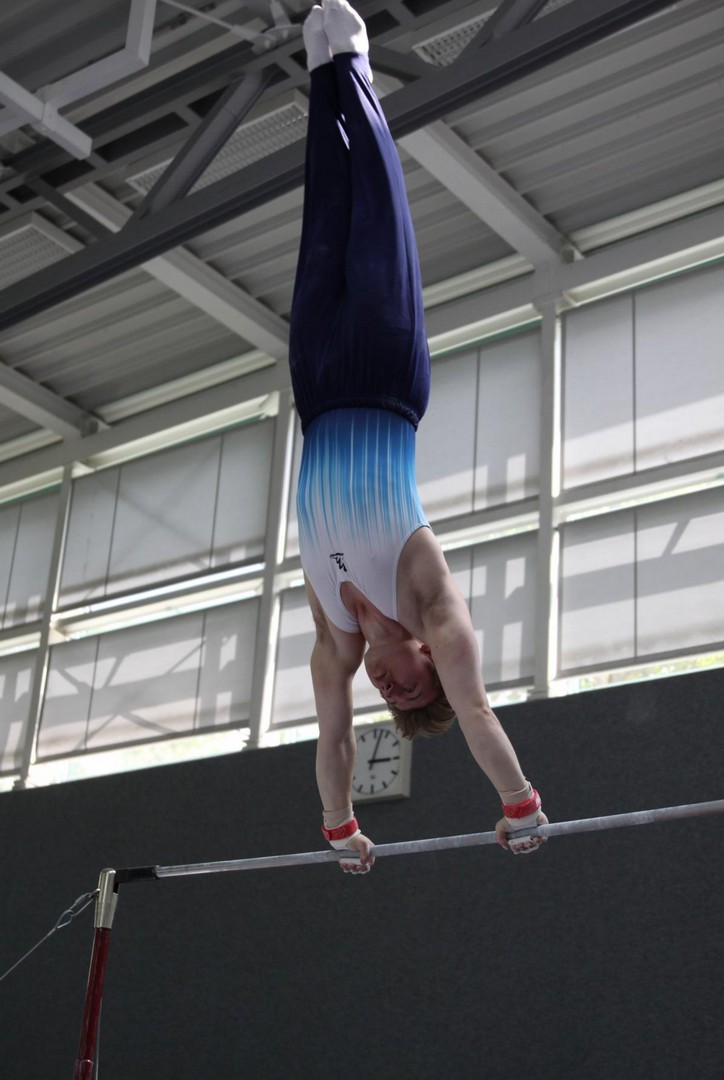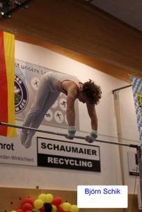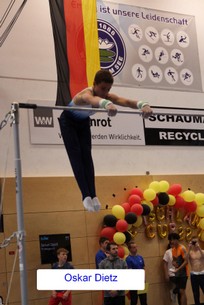 Thomas Quint begann am Seitpferd, eine solide Übung, richtig zum Auftakt. Eine gute Ringeübung, wenn auch mit wackligem Handstand folgt. Danach der Sprung am Tisch, schlecht gelandet, Fuss übertreten, Wettkampf finito! Bleibt alle Hoffnung auf Oskar, der ordentlich nervös ist. Beginnt an den Ringen, gute Übung, Doppelsalto als Abgang, kleiner Schrittfehler, alles okay. Sprung: Überschlag mit Salto rückwärts, auch okay, hohe Punktzahl. Barren, leider mit Zwischenschwung, also Punkte-Abzug. Dann das Reck, eigentlich sicher. Der Aufschwung zum Handstand klappt nicht, also Sturz aufs Gerät, Abzug bis zwei Punkte, Felge nicht hoch, statt der erhofften 11 Punkte nur 8,8 Punkte. Und jetzt liegen die Nerven blank. Am Boden werden die Schwierigkeiten reduziert, trotzdem oder deshalb wenig Abzug für die Ausführung. Seitpferd wieder okay. Am Ende, guter neunter Rang, an einem super Tag wäre es der ersehnte siebte Rang geworden. Und jetzt? Natürlich trainieren für die Qualifikation im kommenden Jahr: Denn dann wird es mindestens der siebte Platz, und außerdem lockt auch die Pfalzmannschaft in der dritten Bundesliga.
