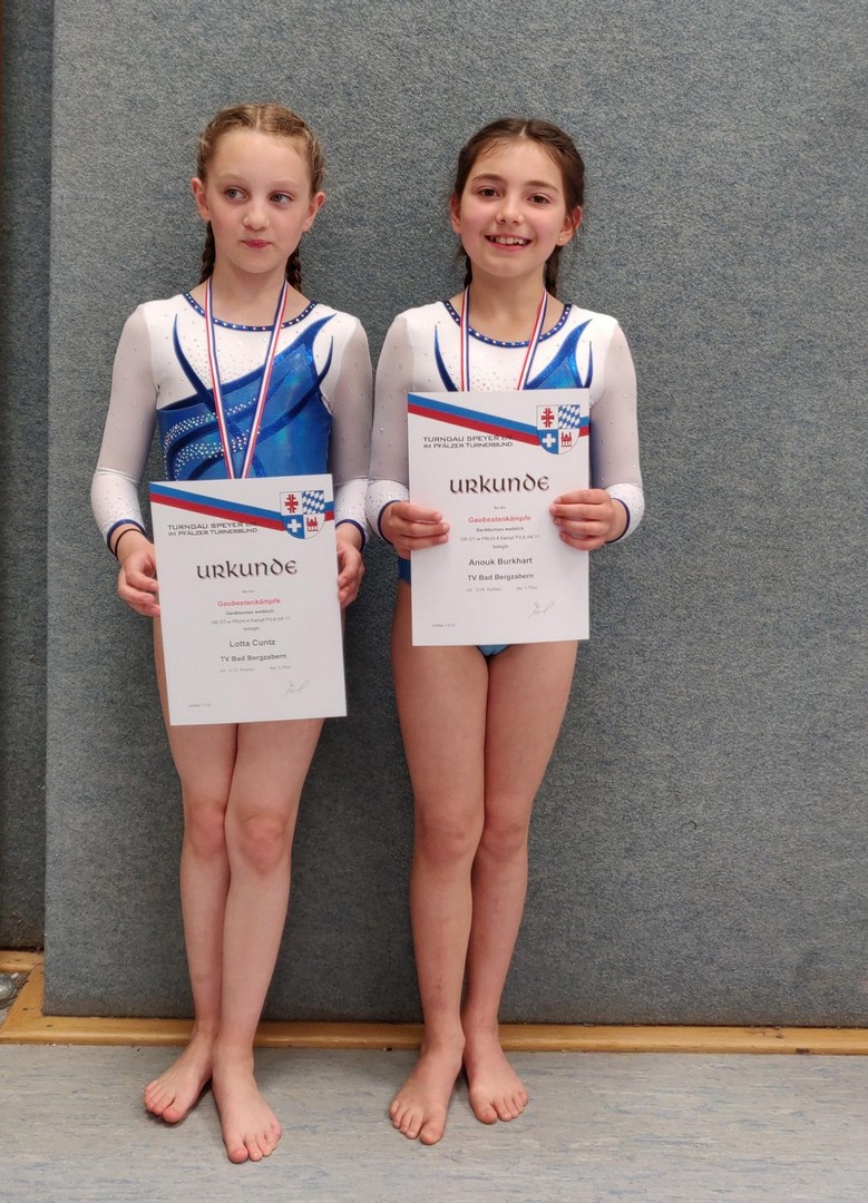 Die Wettkampfklassen unterscheiden sich prinzipiell in die Pflichtwettkämpfe: alle vier Geräte (Sprung,Barren,Balken und Boden) haben vorgeschriebene Übungen, bei denen man allerdings je nach Schwierigkeit variieren kann, und in die Kürwettkämpfe. Ebenfalls alle geräte, mit eigenen Übungskreationen, selbst gewählter Musik am Boden, eben eigentlich vereinfachte Form wie die Spitzenturnerinnen. Auch hier wird aber variiert in vier Leistungsklassen, wobei die LK 1 die höchsten Schwierigkeiten verlangt. In allen Klassen qualifizieren sich die ersten Fünf jedes Wettkampfes auch für die Pfalzmeisterschaften Ende Mai. Um es vorweg zu nehmen, die Geschwister Zlata und Elizaveta Vostretsov, schon vor Corona eine Bank in ihrer Altersklasse, waren auch hier wieder ganz vorne zu finden.
