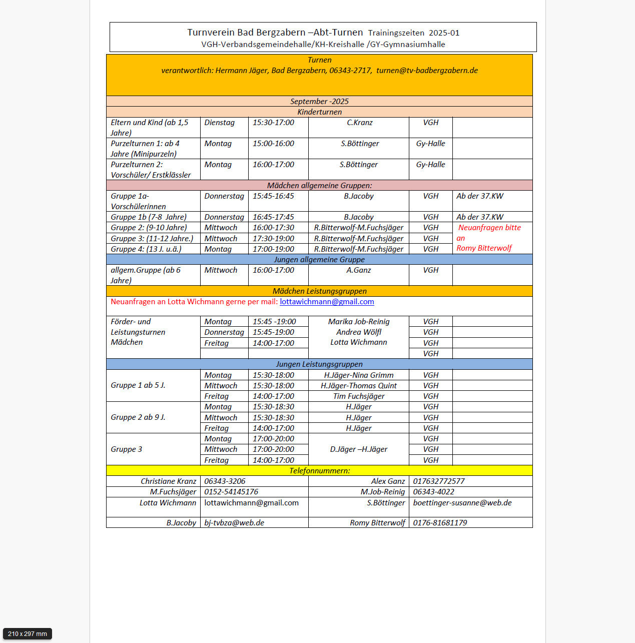 DeTuFe-Deutsches Turn-Fest- größtes Turnevent der Welt, 2025 in Leipzig, mit ca. 80000 Teilnehmern. Da darf der TV Bad Bergzabern natürlich nicht fehlen. Mit knapp 20 Mädchen und Jungen war der TV nach Sachsen gefahren. Primär steht bei solchen Veranstaltungen natürlich die Gemeinschaft im Vordergrund,frühstücken,schlafen in Schulräumen, Erlebnisse auf dem Turnfest, aber auch Wettkämpfe werden bestritten. Wer sich qualifiziert hat, startet im Deutschland-Cup, sozusagen die 2.Bundesliga im Turnen. Ihr Trainer hatte mehrere Jungs gemeldet, und auch die Mädchen waren in diesem Jahr dabei. Bei den Jüngsten (12 Jahre) waren dies Anton Beck und Phil Walter. Schon am Mittwoch durften sie an die Geräte. Und sie waren nicht nur gut vorbereitet, sie erwischten auch einen guten Tag. Mit 59,95 Pu. und 59,5 Pu. landeten sie im 1. Drittel auf dem 8. (Phil) und dem 9.Rang(Anton). Bei der nächsten Jahrgangsstufe war mit Oliver Gerhardt schon ein Oldie dabei. In einem starken Teilnehmerfeld konnte er mit 64,4 Pu. einen 10. Rang erreichen. Hier startete auch Dominik Ganz, der mit 59,25 Pu. auf dem 20. Platz landete. Oskar Dietz war schon mehrfach beim D-Cup. Allerdings tummeln sich in seinem Wettkampf (18-29 Jahre) alle Aktiven, auch viele Turner aus der 2.Bundesliga, die an den Deutschen Meisterschaften die Quali nicht geschafft hatten. Mit 76,5 Pu. verpasste er äußerst knapp die Medaillenränge und landete auf dem 6.Rang. Bei den Mädchen hatte sich bei den 16-Jähr. Elizaveta Vostretsov qualifiziert. Nach den 4 Geräten konnte sie mit 42,7 Pu. als 26. ihre Urkunde in Empfang nehmen. Am Do. turnte David Jäger erstmals bei den Senioren, mit 30 Jahren. Und ihm gelang die Sensation: mit 63,6 Pu. landete er auf dem 2.Platz. Vizemeister. Schon mehrmals hatte er den D-Cup gewonnen. Und jetzt dieser Erfolg. Alle anderen Teilnehmer absolvierten einen Pokalwettkampf oder starteten im Wahlwettkampf , der aber bei Redaktionsschluss noch nicht zu Ende war.