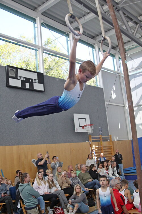 Der drittte Durchgang war natürlich der interessanteste: die Jüngsten mit 7 Jahren im Programm des Deutschen Turnerbundes, wie auch die Senioren mit dem 82-jährigen Klaus Burger aus Speyer, den Kürturnern mit dem erleichterten Programm und den Spitzenturnern, die gemäß dem internationalen Code de Pointage folgen. Und daneben noch der Pokalwettbewerb, bei dem die Einzelgeräte bewertet werden. Elias Nass und Lev Vostretsov , beide 7 Jahrre, wollten zeigen, was sie schon können, und mit dem 2.und 3.Rang motivierten sie sich sicher für die Zukunft. Anton Beck, Dominik Ganz und Bruno Beck wagten sich auch in diesem Jahr an die erleichterten Kürübungen, und mit Erfolg, ein erster, ein zweiter und ein dritter Rang, also ein Triplett, sind ein präsentables ergebnis. Der Erfahrendste und Erfolgreichste unter allen ist sicher David Jäger. Und seine Geräte Seitpferd und Reck lässt er sich nicht nehmen, sowohl im Pokal als auch beim Sechs-Kampf holte er sich hier die Krone. Dario Weis, Konrad Beck nach mehrjähriger Pause, wie auch Thomas Quintturnen zwar derzeit keinen vollen wettkampf, aber an „ihren“ Geräten traten sie im Pokal an und landeten immer im ersten Drittel. Ein zweiter Stern glänzte äußerst hell: Oskar Dietz. Er turnte als Einziger den CdP-Wettkampf voll durch, sammelte Punkte für die Qualifikation zu den Deutschen Jugend-Meisterschaften. Auch an den Ringen zeigt er normalerweise den Doppelsalto als Abgang. Die Fotografin war bereit, aber dann reichte es doch „nur“ zum einfachen Strecksalto. Den Dosa turnte er dafür am Reck. Auch Semjon Geist hielt beim CdP-WK mit. Und Oliver Gerhardt verteidigte seinen Titel aus dem vergangenen Jahr. 11 Titel heimsten das Trainer-Gespann David und Hermann Jäger und Beate Jacoby ein, nicht gerechnet die 2-und 3.Plätze, die Erfolge bei den Jungs, die ihren ersten Wettkampf turnten. Ein Auftakt nach Mass für den TV Bad Bergzabern, für den Speyergau und die gute Hoffnung auf die Pfalzmeisterschaften schon am kommenden Wochenende.