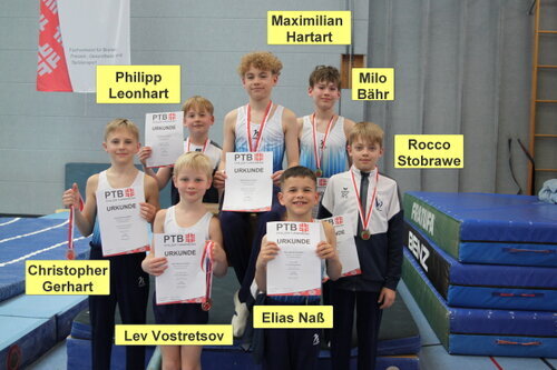 Die Jüngsten (11 Jahre u.jünger) hatten sich in der Pflicht qualifiziert: Anton Beck, Christopher Gerhardt, Maximilian Hartardt und Phil Leonhart. Acht Konkurrenten turnten um die Krone. Schlechte Karten an den Ringen, nur 37,9 Punkte, 6 Pu. weniger als die Konkurrenz aus Stadecken-Elsheim. Alle anderen Geräte gehörtem mit knappem Vorsprung den Kurstädtern, Reck allerdings mit einem Zehntel an die Konkurrenz verschenkt. Und auch in der Einzelwertung war Anton auf dem 2.Rang, Maximilian auf dem 3.Rang. Mit 257,05 Punkten betrug der Vorsprung am Ende drei Punkte vor dem Vizemeister. Dahinter klaffte schon eine Lücke mit über 10 Punkten. Für die Trainer, die die Jungen ja in den nächsten Jahren zur Pflicht führen wollen, eine positive Aussicht.