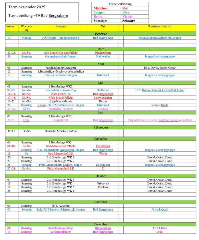 DeTuFe-Deutsches Turn-Fest- größtes Turnevent der Welt, 2025 in Leipzig, mit ca. 80000 Teilnehmern. Da darf der TV Bad Bergzabern natürlich nicht fehlen. Mit knapp 20 Mädchen und Jungen war der TV nach Sachsen gefahren. Primär steht bei solchen Veranstaltungen natürlich die Gemeinschaft im Vordergrund,frühstücken,schlafen in Schulräumen, Erlebnisse auf dem Turnfest, aber auch Wettkämpfe werden bestritten. Wer sich qualifiziert hat, startet im Deutschland-Cup, sozusagen die 2.Bundesliga im Turnen. Ihr Trainer hatte mehrere Jungs gemeldet, und auch die Mädchen waren in diesem Jahr dabei. Bei den Jüngsten (12 Jahre) waren dies Anton Beck und Phil Walter. Schon am Mittwoch durften sie an die Geräte. Und sie waren nicht nur gut vorbereitet, sie erwischten auch einen guten Tag. Mit 59,95 Pu. und 59,5 Pu. landeten sie im 1. Drittel auf dem 8. (Phil) und dem 9.Rang(Anton). Bei der nächsten Jahrgangsstufe war mit Oliver Gerhardt schon ein Oldie dabei. In einem starken Teilnehmerfeld konnte er mit 64,4 Pu. einen 10. Rang erreichen. Hier startete auch Dominik Ganz, der mit 59,25 Pu. auf dem 20. Platz landete. Oskar Dietz war schon mehrfach beim D-Cup. Allerdings tummeln sich in seinem Wettkampf (18-29 Jahre) alle Aktiven, auch viele Turner aus der 2.Bundesliga, die an den Deutschen Meisterschaften die Quali nicht geschafft hatten. Mit 76,5 Pu. verpasste er äußerst knapp die Medaillenränge und landete auf dem 6.Rang. Bei den Mädchen hatte sich bei den 16-Jähr. Elizaveta Vostretsov qualifiziert. Nach den 4 Geräten konnte sie mit 42,7 Pu. als 26. ihre Urkunde in Empfang nehmen. Am Do. turnte David Jäger erstmals bei den Senioren, mit 30 Jahren. Und ihm gelang die Sensation: mit 63,6 Pu. landete er auf dem 2.Platz. Vizemeister. Schon mehrmals hatte er den D-Cup gewonnen. Und jetzt dieser Erfolg. Alle anderen Teilnehmer absolvierten einen Pokalwettkampf oder starteten im Wahlwettkampf , der aber bei Redaktionsschluss noch nicht zu Ende war.