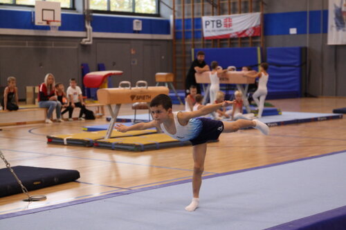 Der drittte Durchgang war natürlich der interessanteste: die Jüngsten mit 7 Jahren im Programm des Deutschen Turnerbundes, wie auch die Senioren mit dem 82-jährigen Klaus Burger aus Speyer, den Kürturnern mit dem erleichterten Programm und den Spitzenturnern, die gemäß dem internationalen Code de Pointage folgen. Und daneben noch der Pokalwettbewerb, bei dem die Einzelgeräte bewertet werden. Elias Nass und Lev Vostretsov , beide 7 Jahrre, wollten zeigen, was sie schon können, und mit dem 2.und 3.Rang motivierten sie sich sicher für die Zukunft. Anton Beck, Dominik Ganz und Bruno Beck wagten sich auch in diesem Jahr an die erleichterten Kürübungen, und mit Erfolg, ein erster, ein zweiter und ein dritter Rang, also ein Triplett, sind ein präsentables ergebnis. Der Erfahrendste und Erfolgreichste unter allen ist sicher David Jäger. Und seine Geräte Seitpferd und Reck lässt er sich nicht nehmen, sowohl im Pokal als auch beim Sechs-Kampf holte er sich hier die Krone. Dario Weis, Konrad Beck nach mehrjähriger Pause, wie auch Thomas Quintturnen zwar derzeit keinen vollen wettkampf, aber an „ihren“ Geräten traten sie im Pokal an und landeten immer im ersten Drittel. Ein zweiter Stern glänzte äußerst hell: Oskar Dietz. Er turnte als Einziger den CdP-Wettkampf voll durch, sammelte Punkte für die Qualifikation zu den Deutschen Jugend-Meisterschaften. Auch an den Ringen zeigt er normalerweise den Doppelsalto als Abgang. Die Fotografin war bereit, aber dann reichte es doch „nur“ zum einfachen Strecksalto. Den Dosa turnte er dafür am Reck. Auch Semjon Geist hielt beim CdP-WK mit. Und Oliver Gerhardt verteidigte seinen Titel aus dem vergangenen Jahr. 11 Titel heimsten das Trainer-Gespann David und Hermann Jäger und Beate Jacoby ein, nicht gerechnet die 2-und 3.Plätze, die Erfolge bei den Jungs, die ihren ersten Wettkampf turnten. Ein Auftakt nach Mass für den TV Bad Bergzabern, für den Speyergau und die gute Hoffnung auf die Pfalzmeisterschaften schon am kommenden Wochenende.
