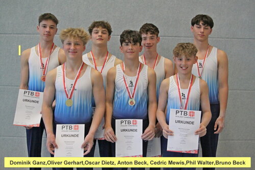 Die Jüngsten (11 Jahre u.jünger) hatten sich in der Pflicht qualifiziert: Anton Beck, Christopher Gerhardt, Maximilian Hartardt und Phil Leonhart. Acht Konkurrenten turnten um die Krone. Schlechte Karten an den Ringen, nur 37,9 Punkte, 6 Pu. weniger als die Konkurrenz aus Stadecken-Elsheim. Alle anderen Geräte gehörtem mit knappem Vorsprung den Kurstädtern, Reck allerdings mit einem Zehntel an die Konkurrenz verschenkt. Und auch in der Einzelwertung war Anton auf dem 2.Rang, Maximilian auf dem 3.Rang. Mit 257,05 Punkten betrug der Vorsprung am Ende drei Punkte vor dem Vizemeister. Dahinter klaffte schon eine Lücke mit über 10 Punkten. Für die Trainer, die die Jungen ja in den nächsten Jahren zur Pflicht führen wollen, eine positive Aussicht.